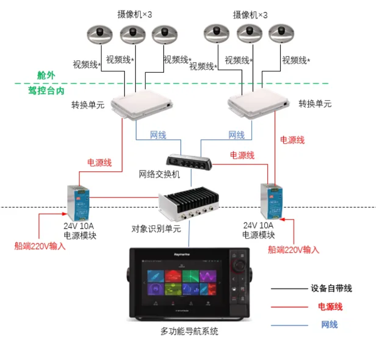 该系统的前端由6个分别安装在船体周围的摄像头组成,从不同角度拍摄船舶周围的实时画面;经转换单元将将摄像头拍摄的原始视频信号转换为可处理的数字信号,传输给识别单元;将6个摄像头拍摄的画面自动拼接成一幅完整的360度环船图像消除盲区,辅助船舶靠离泊。