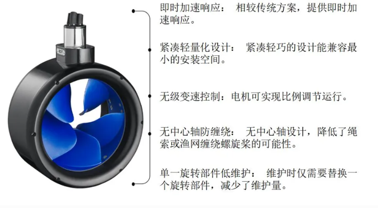 防缠绕 | 无轴设计最大限度防止了水中杂物缠绕(如海草渔网等) |