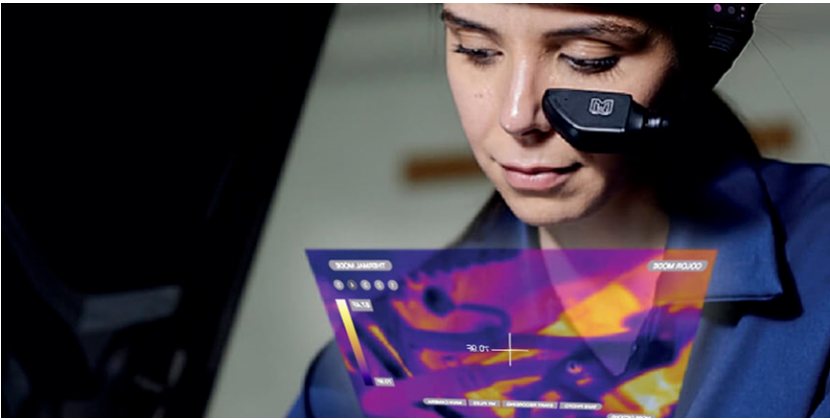 头戴式设备的红外热像仪模块使佩戴者能够捕获高分辨率可见光和热图像,以快速定位工业设备中的温度异常。