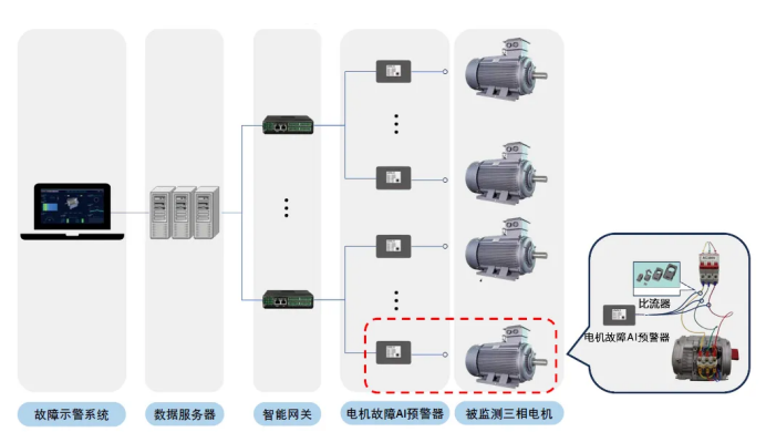 极早期电机故障AI预警系统由电机故障AI预警器,智能网关,数据服务器,故障示警系统等组成。电机故障AI预警器用于采集和实时分析被检测三相电机的电流数据,并向智能网关发送分析后的报警数据;数据服务器用于存储报警数据;故障示警系统用于管理,分发,展示报警数据。