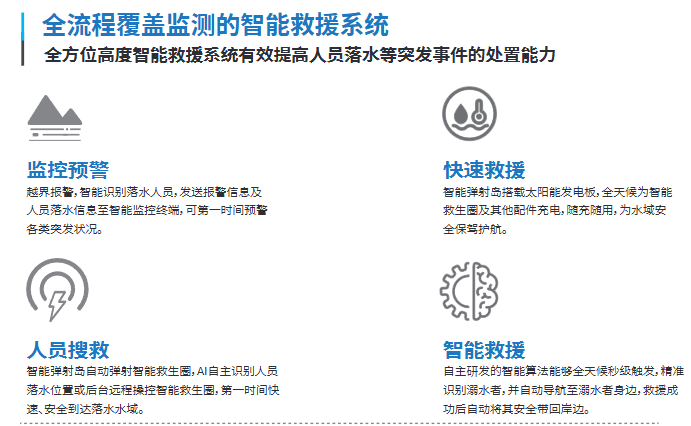 以人工智能、GIS、智能导航与控制、智能决策和路径规划等信息化技术为基础,构建集岸基预警监测、人员落水报警、落水人员定位、自动实施救援、险情态势分析为一体的全天候、快速、准确、智能化的新型水上智能化救援模式,全方位守护各类水域的安全。