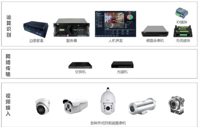 利用安装在机械设备或现场建筑物上的相机获取视频,通过AI分析进行人员、车辆的识别,当识别到人员、车辆进入特定区域时发生报警,并将报警信号上传至上层管理系统,用于触发后续业务逻辑,如设备停车、现场驱离喊话等。