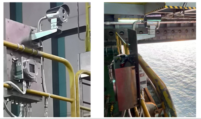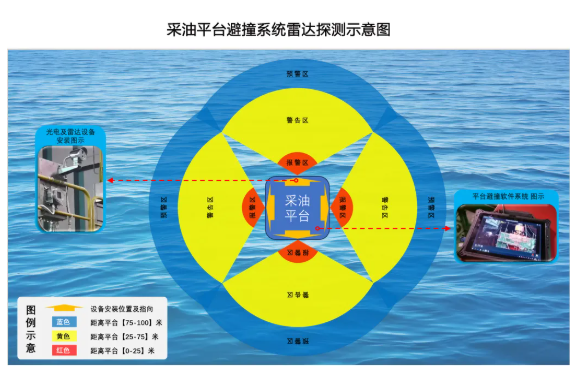采油平台避撞系统由雷达、防爆摄像机、防爆平板等组成。在采油平台四周安装雷达、防爆摄像机来实现避碰预警功能,通过雷达实时检测前方范围内是否有目标,发现目标在报警范围内,系统会实时报警,并在平板触发过程录像。具体安装数量,也可根据实际情况调整。