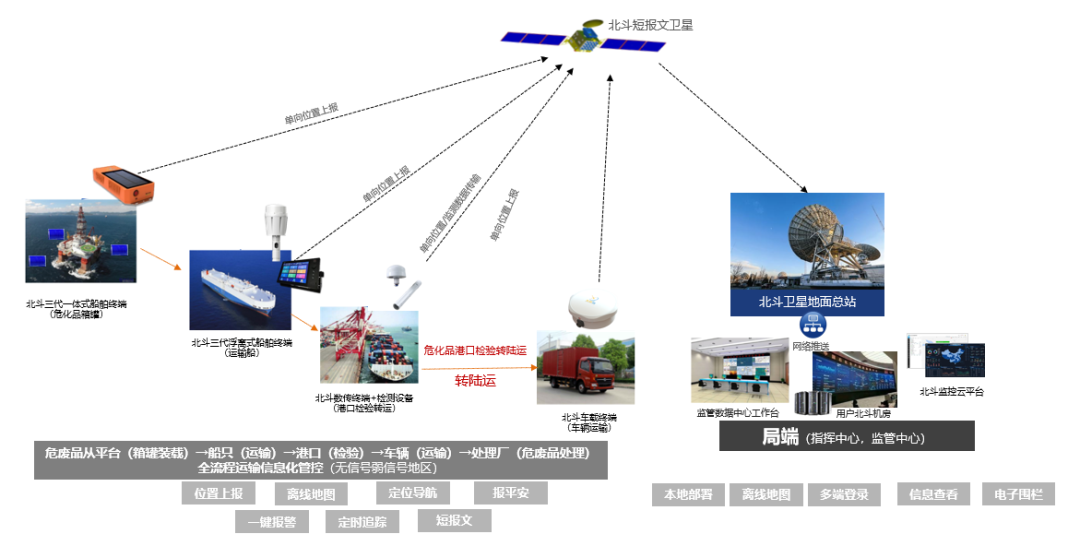 为做好海上石油生产平台危废品全程监管信息系统的研制工作,实现危废品从平台(箱罐装载)→船只(运输)→港口(检验)→车辆(运输)→处理厂(危废品处理)的全流程运输信息化管控,通过北斗数传终端将数据上报到监管中心。