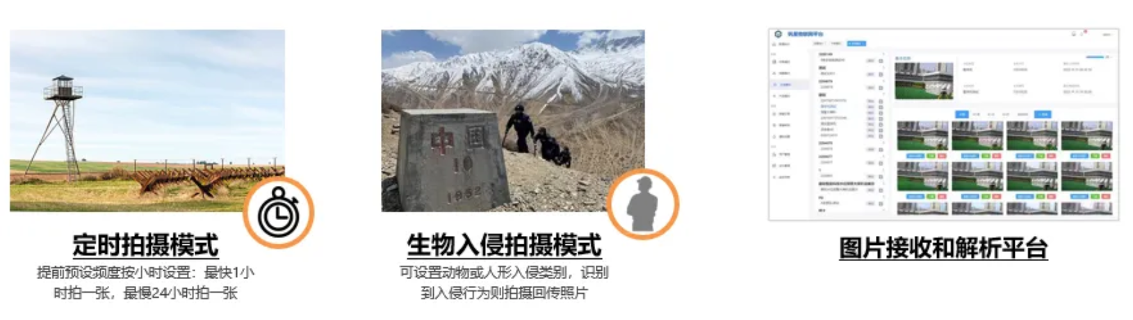 采用太阳能电池供电、北斗短报文回传,可在野外无信号区域长时间作业;摄像头拍到变化画面后,通过北斗三号短报文回传到后端;摄像头可以分辨人形,动物等,也可以定时拍照回传、可按用户使用需求制定回传策略;内置渐进式图片压缩算法,可有效压缩相片传输到后台后还原。