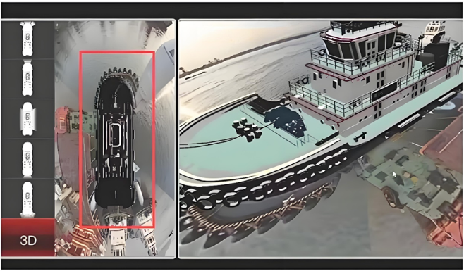 俊泰360°全景影像系统在船身布置多组广角相机,并接入图像拼接系统,将来自船舶各方位的视角进行拼接处理,合成环绕船舶的实景影像,还可以根据实际需要切换成单独的视角。这样一来,驾驶台可以通过视频更加直观地掌握离靠泊距离,监视船舶四周的障碍物等,如同开启了“上帝之眼”,进一步提升航行与靠泊的安全和效率。