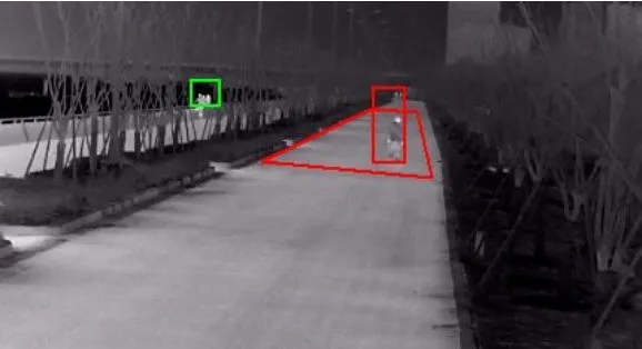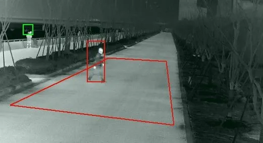 在画面中设定相应的警戒区域,当有物体进入到警戒区域中并在区域内徘徊或者停留时,将触发区域入侵报警规则,热成像摄像机会立即发出报警信号。